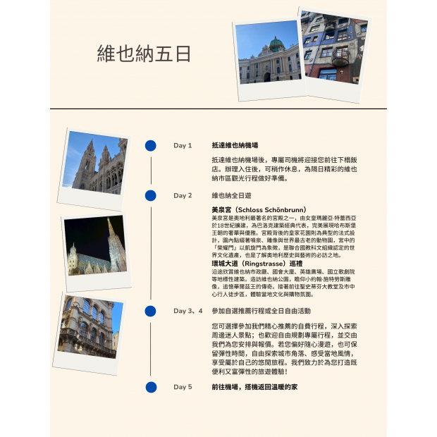 - 其他交通費與個人旅遊保險(如需保險,本公司可提供相關建議與協助)。